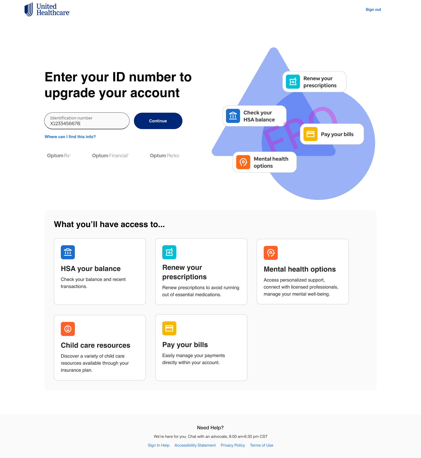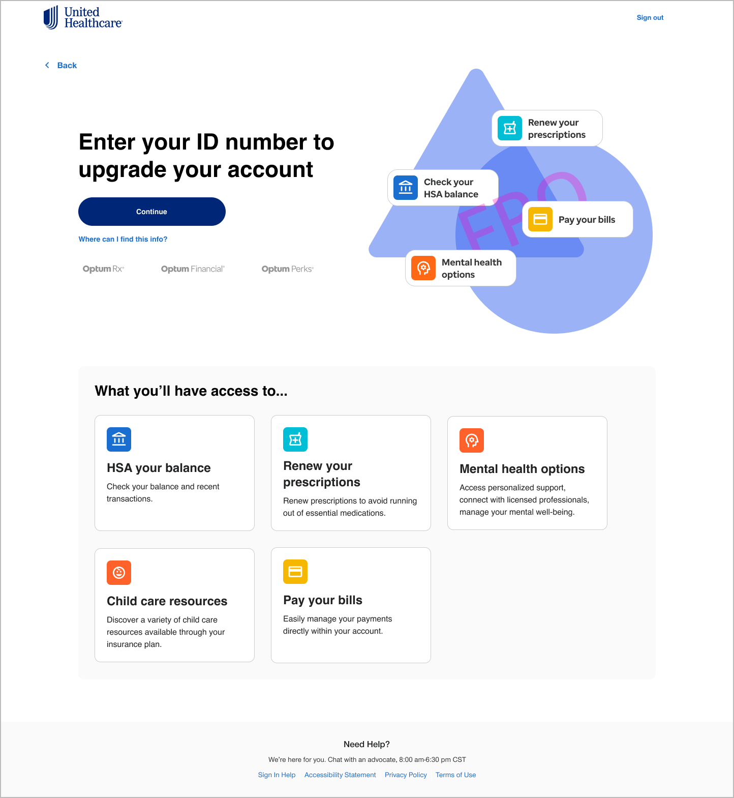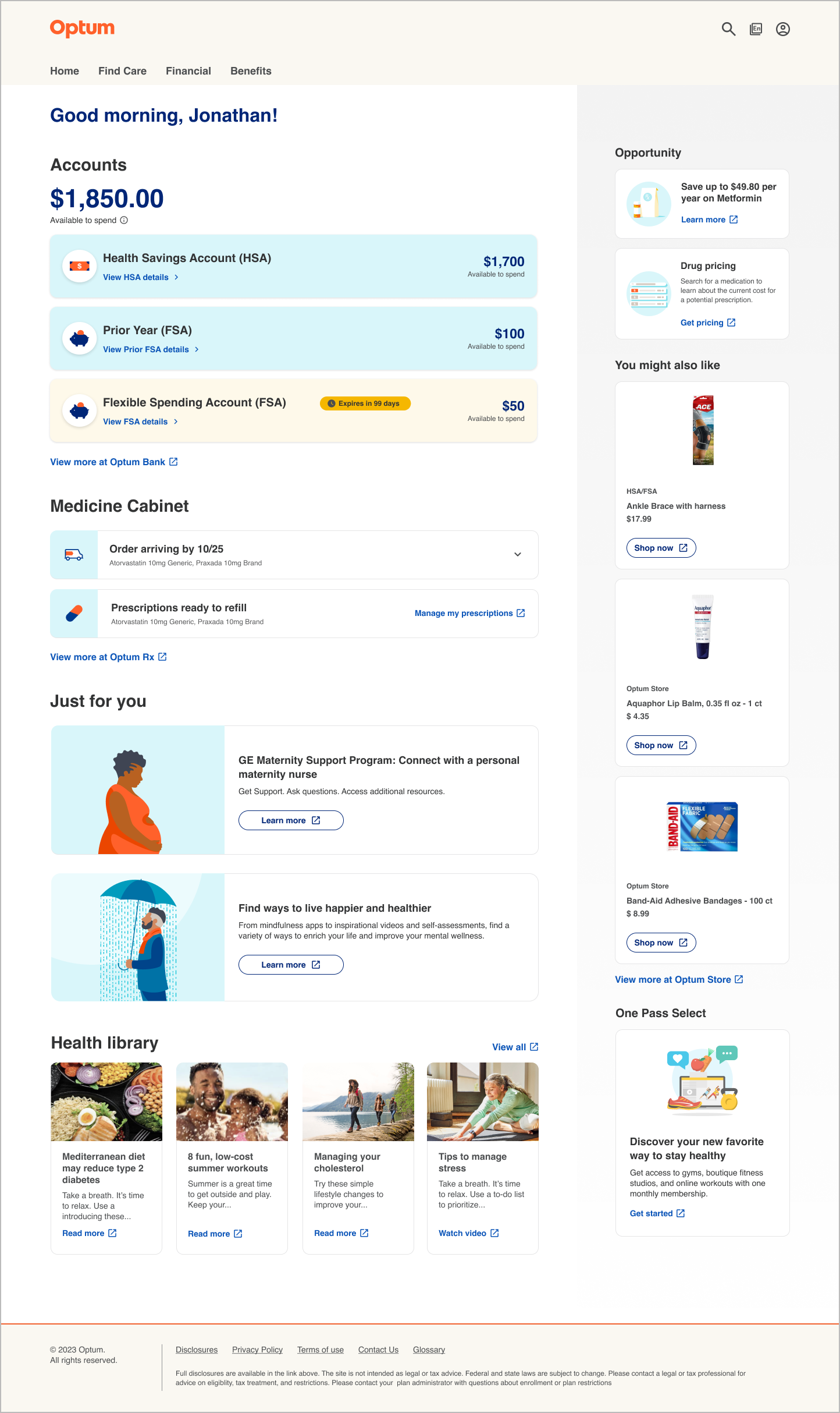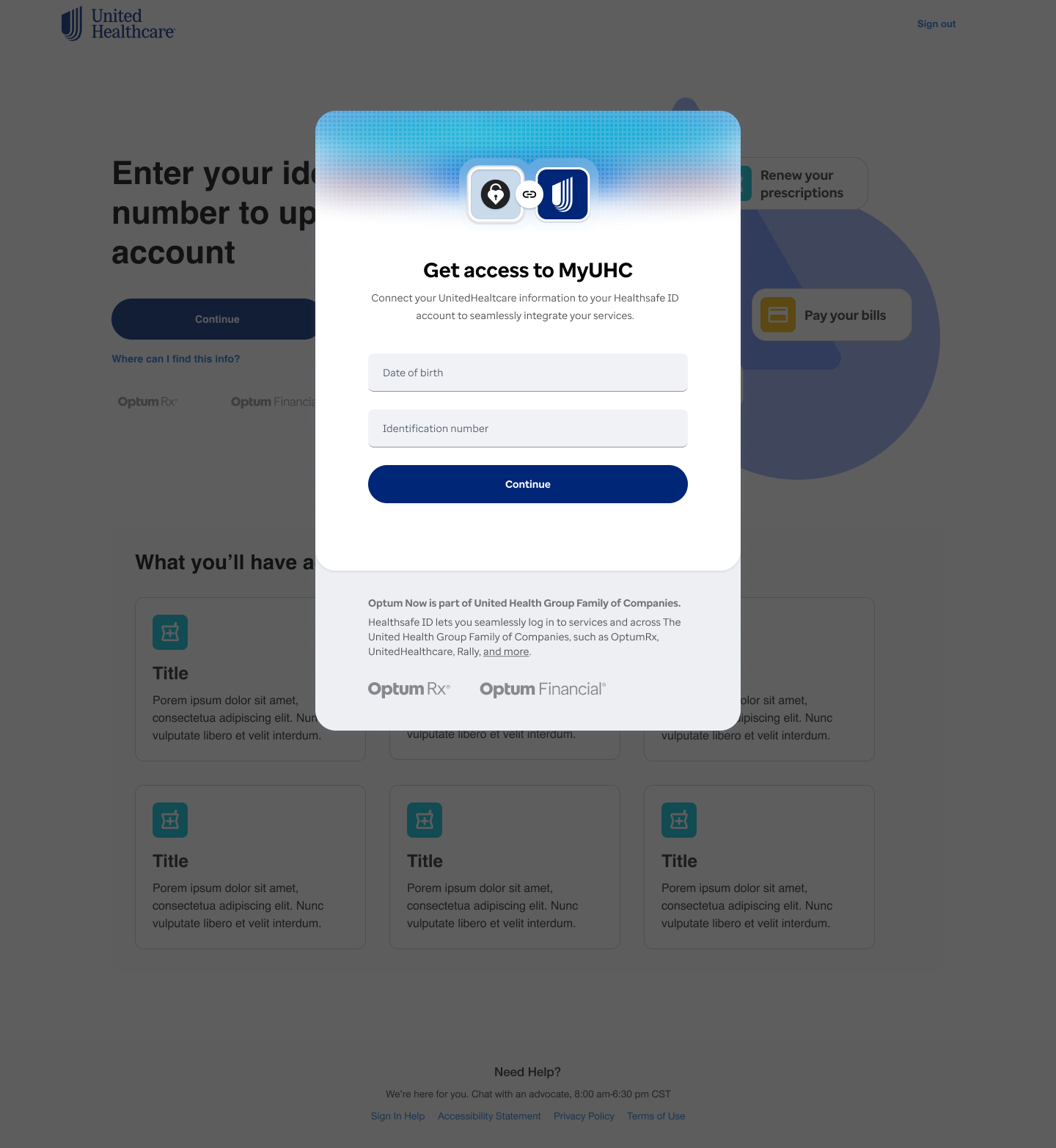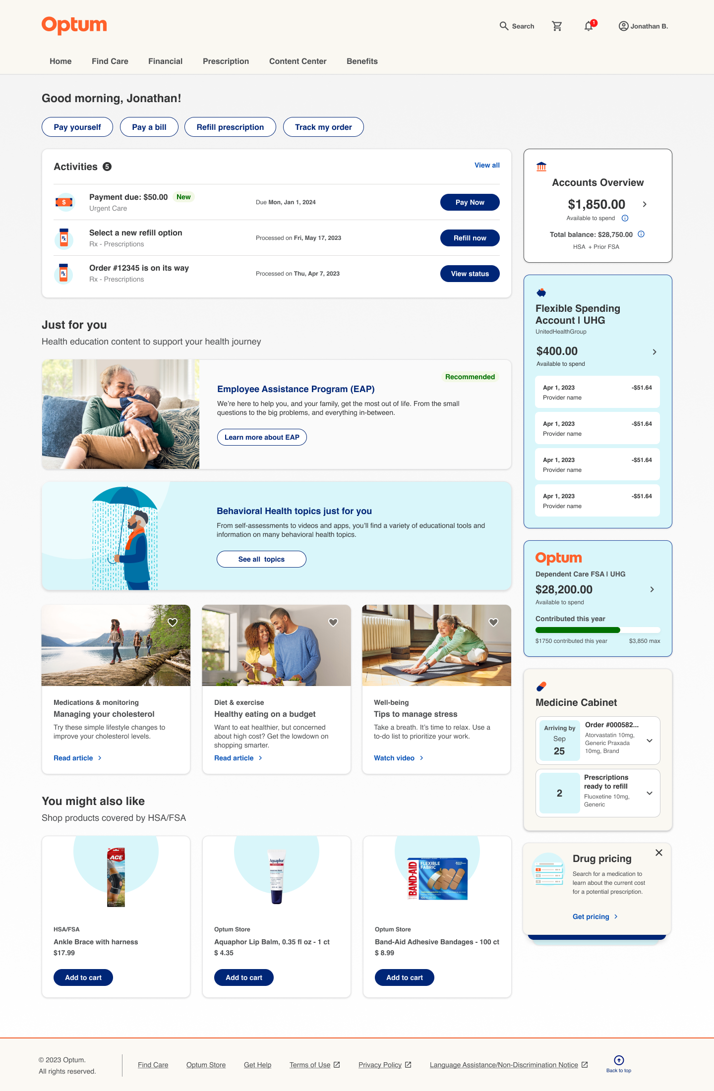 Optum has a wide variety of products that put the user in the position of creating accounts and logging into each of the them to view their account information. This creates a lot of excess time for the user to navigate around all their accounts and puts a strain on the business call centers. Business wants an all-in-one product dashboard that links the popular features of each products together in one interactive space.