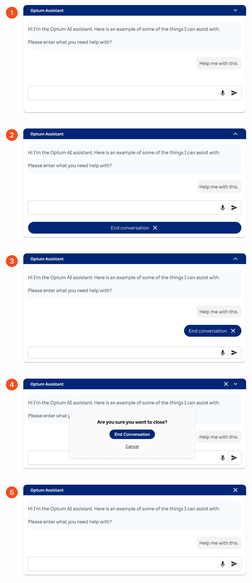 - Closes conversation, but doesn't delete it unless user ends chat. User can reopen window and continue.