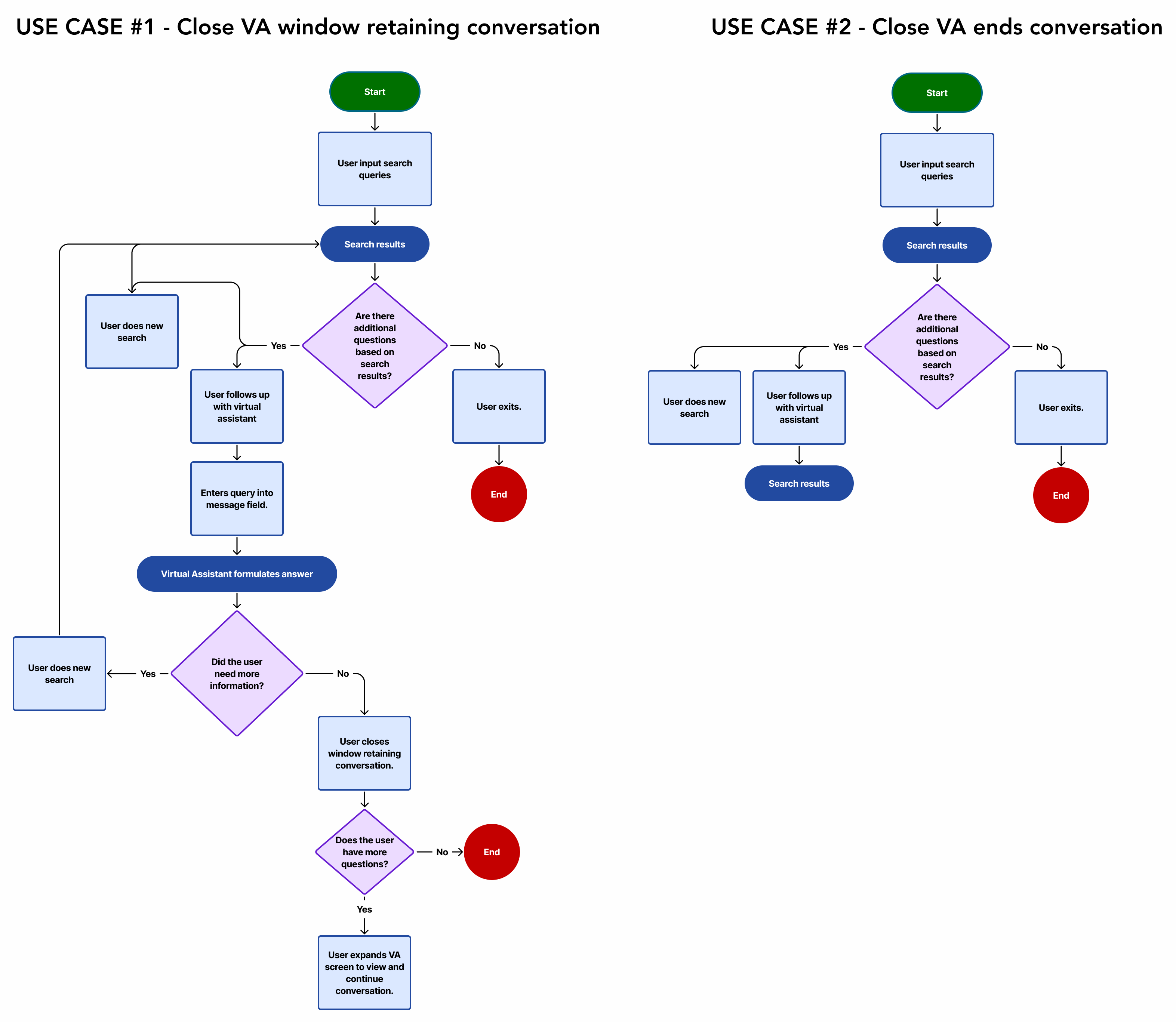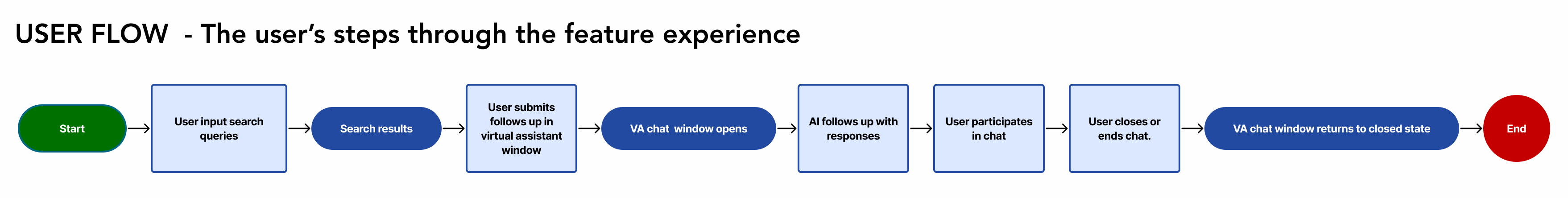 The virtual assistant will temporarily work as added support to the search results, but it needs to be scalable to include capabilities for additional conversations. What would that look like for the interface and would it function the same? A user flow was mapped out to help plan in interations.