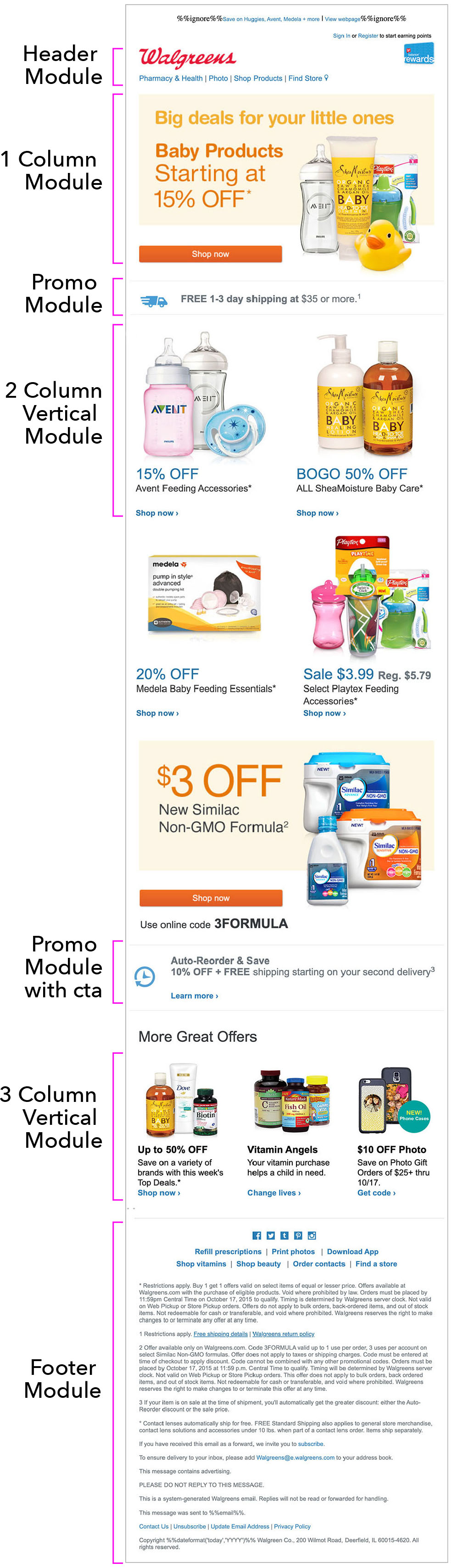 Walgreen's followed the process of developing 1, 2 and 3 column modules for simple repurposing and timesaving construction. The role at Walgreen's involved debugging email code, testing in multiple email clients for consistancy, and scheduling for delivery in the company's proprietary EMP.